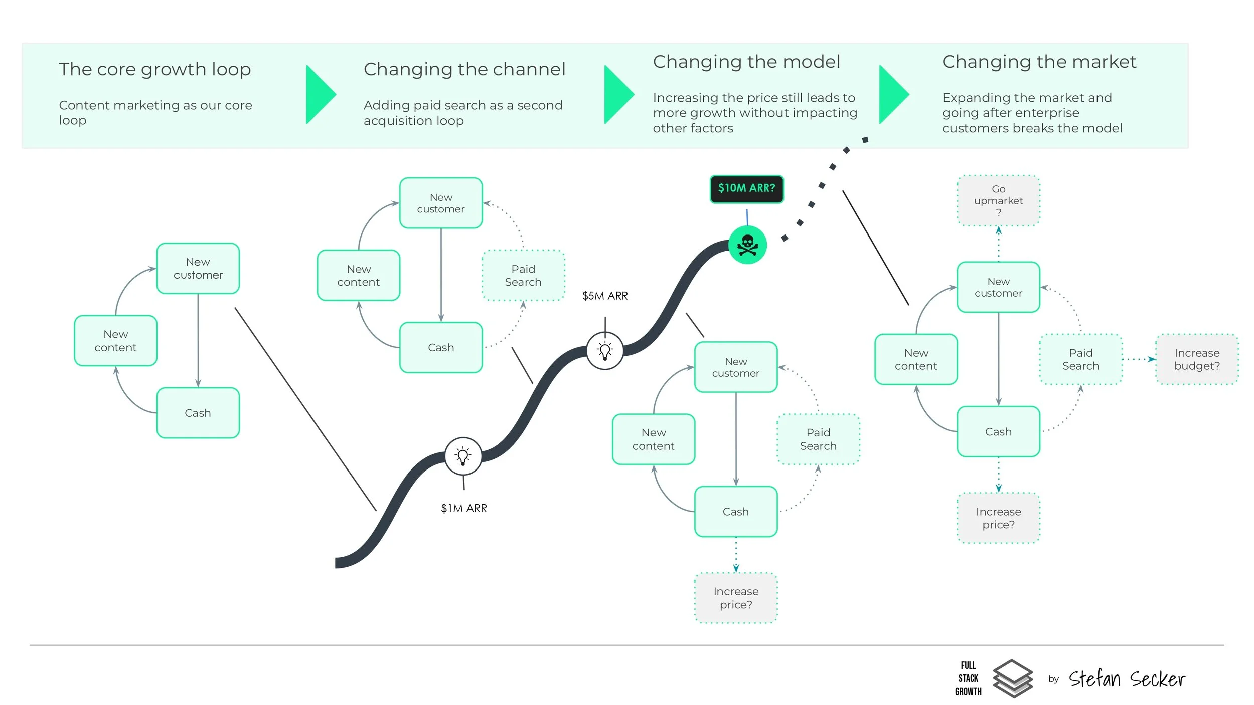 The plateau between $5M and $10M ARR could not be cracked by simply expanding channels, or adding new ones. Since we had also exhausted the option of a pricing increase, we needed to redesign the entire growth model.